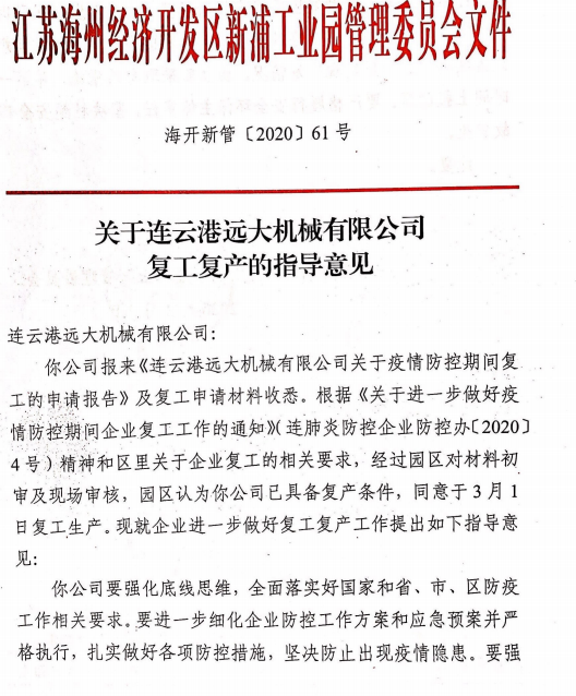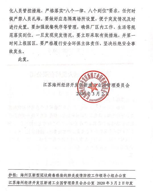 在前期的精心準備下,我公司已于3月1日通過疫情防控、安全生產、環(huán)保生產三項驗收,3月2日獲得復工批文并于今日正式復工。公司將強化底線思維,全面落實好國家和省、市、區(qū)防疫工作的相關要求。在扎實做好各項防控措施的基礎上,堅決杜絕疫情的發(fā)生。